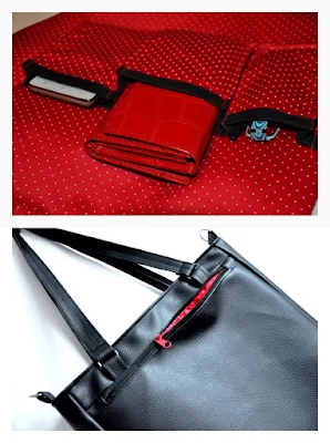 Tyhle vychytaný kapsičky na mobil, brýle a peněženku mám moc ráda. Vše krásně při ruce a hezky srovnané. Další větší kapsa je na zadní straně. A podle hesla: kapes není nikdy dost - ještě jedna zipová kapsa je uvnitř kabely, jenže tu jsem zapomněla vyfotit.
